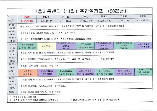 고흥지등복지센터 (2023년 11월) 주간 일정표 입니다. 매일매일 어르신께 사랑과 섬김을 실천하는 고흥지등복지센터가 되도록 최선을 다하겠습니다. 오늘도 좋은 하루 보내세요. 감사합니다. |