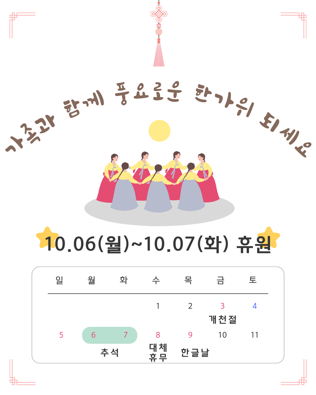 | 제목 | 10월6일(월), 7일(화) 명절 휴원 안내입니다. | 공지일 | 2025.09.18 |